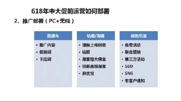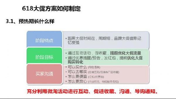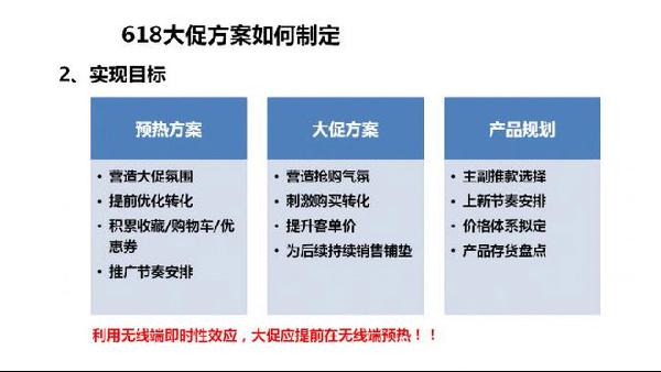 首先,我们要有预热方案,正常的预热方案包含了营造大促氛围、提前优化转化、积累收藏/购物车/优惠券,推广节奏安排。同时,要有大促方案,例如营造抢购氛围、刺激购买转化、提升客单价、为后续持续销售铺垫,最后我们一定要有产品的规划。例如主副推款选择、上新接受的安排、价格体系拟定、产品存货盘点等。尤其是,我们要利用无线端的即时性效应,在PC端预热之前,我们可以在无线端提前2~3天进行预热。因为无线端的访问更加随时随地,获得的效果更加好。而且,我们要思考在无线端做一些营造抢购气氛、刺激购买转化的活动,这样的效果会更加好。