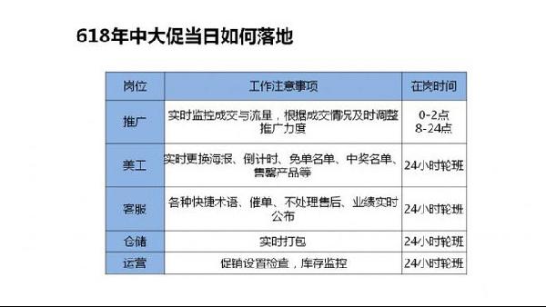 结合前面的各个时期的营销玩法,落实到各个岗位分工,包括的维度有:具体时间节点、具体的人员需要执行的具体内容。例如美工要做预热页面、大促首页、大促后首页、宝贝详情页优化、大促各种试试海报、大促售罄图、大促推广图、大促秒杀等; 客服方面就要做好主动提醒收藏、提前设置快捷术语、设置旺旺签名、自动回复短语、补差价安抚术语等等; 仓储方面需要核实安全库存、配备打包人员、提前质检、50%的主副推款提前打包、多次短信通知老客户等;