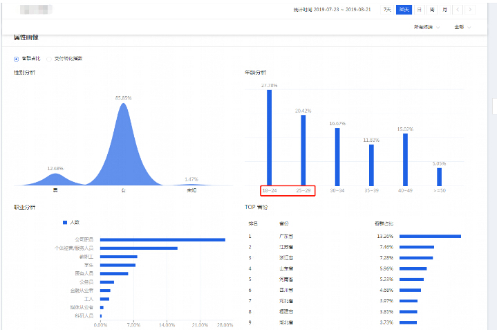 分析我们产品背后的消费者(买家群体),比如我是卖连衣裙的,主要集中在年轻的女性群体,重点集中在年轻爱美的女性群体上,一般以18-24岁、25-29岁的女性群体为主。其次分析消费者的职业占比,消费额度,一般高消费的人群可以买高客单价的产品,也可以买低客单价的产品,但是低消费人群未必都会去买高客单价的产品,这就造成了转化方面的差异。