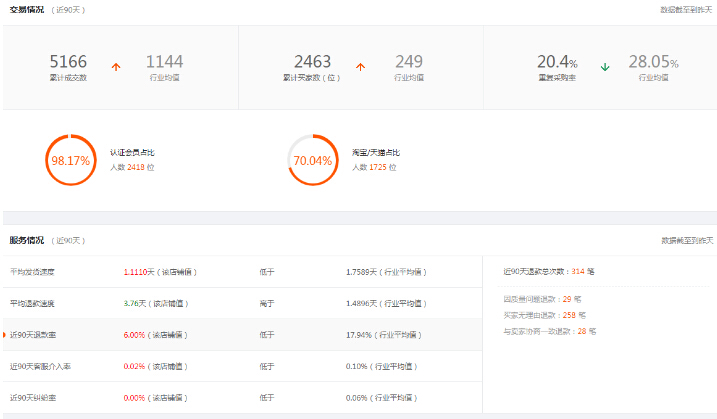 接下来要看厂家的一些数据指标,成交笔数,重复采购率的几率越高,说明这家店铺的产品,在分销上产生的结果越好,近90天退款率,近90天客服介入率,近90天纠纷率,平均发货速度,速度过慢的会非常耽误你做淘宝,平均退款速度,店铺总体满意度等这些数据是否在行业平均值以上,在一个是看厂家的保障服务,实力保障,材质保障,XX天包换,交期保障,XX天无理由包退,买家保障,免费赊账,其他评估标准,是否是实力商家看全店风格是否统一,模特是否统一,招商门槛高,检查是否是串货店铺,实力保障项目越多,时间越长那么对你们而言就越安全越省心。前期更加轻松的去做分销货源,提升初期的成功几率,保障越多对以后出现纠纷的解决也有利。这里要重点关注重复采购率发货速度退款速度,重复采购率高说明厂商安品质量还不错,只有买家反响不错才会复购也从侧面说明厂家产品质量,发货速度跟退货速度关系到你后续产品供应的问题,这里当然也是越快越好。