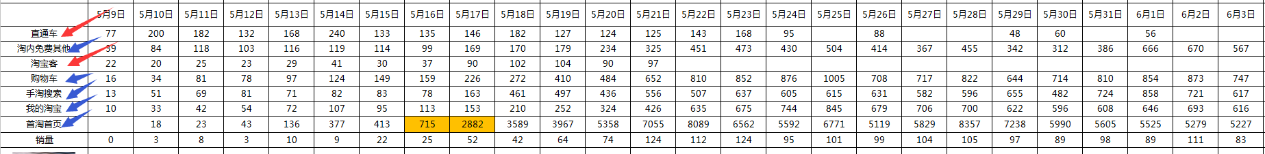 上面表格中,红色箭头为付费推广流量,其中以直通车为主导,而蓝色箭头为免费流量数据统计栏。不难看出,5月14号之前,直通车的投入是越来越大的,但是为什么5月14号之后直通车投入就减少了呢?因为直通这这几天的推广已经逐渐把免费流量带起来了,特别是手淘首页流量在5月17号出现爆发式增长,自此以后即使直通车逐渐减少投放也改变不了扎个趋势。为什么这个款的免费流量会被带动的这么快呢?你只看到了他有开直通车,不知道他是怎么开的,在什么条件下开的,盲目的去跟风开车除了亏还是亏!所以千万不要“无证驾驶”,让我们来谈谈如何获取直通车“驾照”吧。