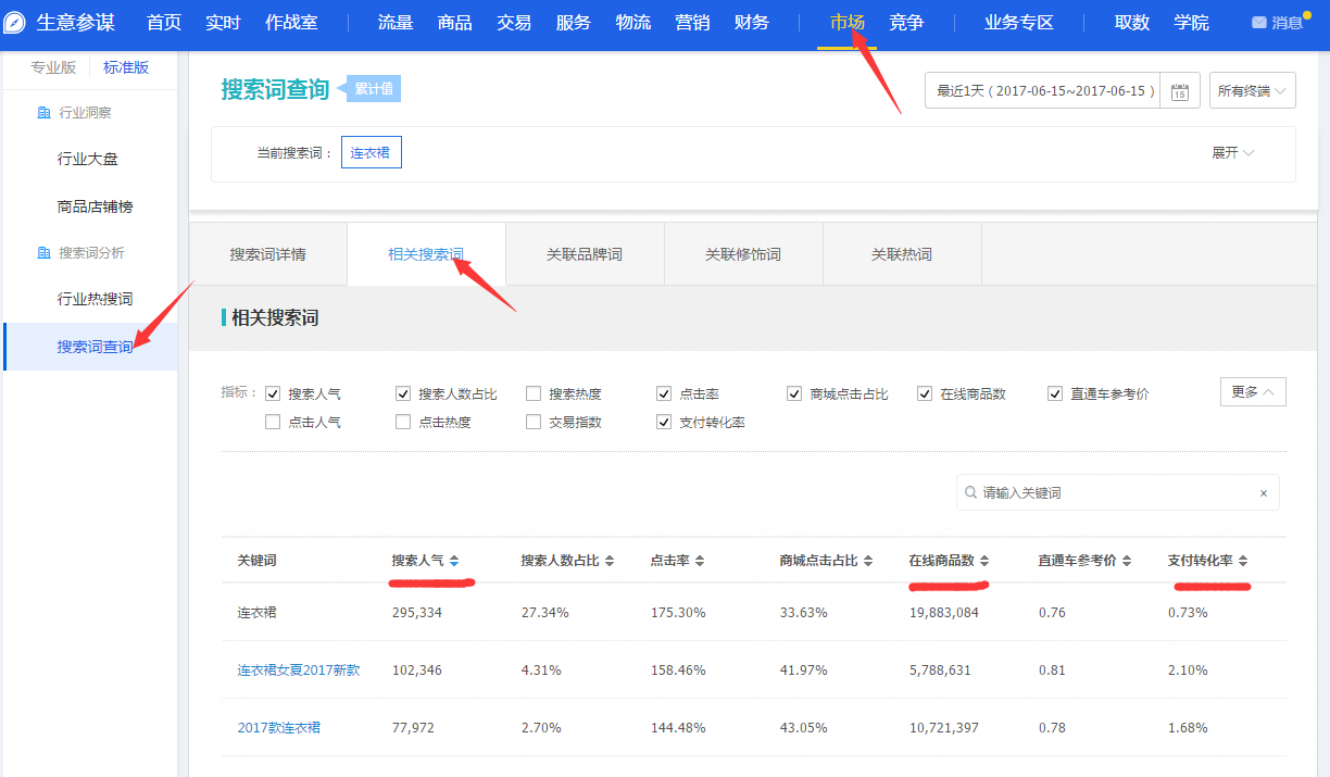 做完前面三个步骤,你是已经否跃跃欲试想去实操了呢?朋友,你还差最后一步!标题优化和价格定位是最简单但是有最容易被人忽略的环节。什么样的标题最容易迎合直通车带动自然搜索流量?大家是否忘记了直通车关键词质量分收到相关性的影响,而相关性就包括宝贝标题。其中相关性越高,直通车带动效果就越明显。很多人只知道在生意参谋搜索词查询中找搜索人气高,在线商品数少且转化率高的词来组织标题。(如下图)