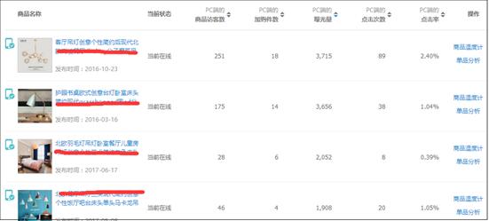打开你的生意参谋——商品——商品效果——最近7天的数据,然后看PC端的数据(当然,你会告诉我,现在谁还看PC端的数据,都看无线端了好不好,但是你要注意,目前生意参谋无法把曝光量、点击次数这些数据表现出来,并且从整体效果上来看,你探查的是点击率,这是有一定的代表性的)