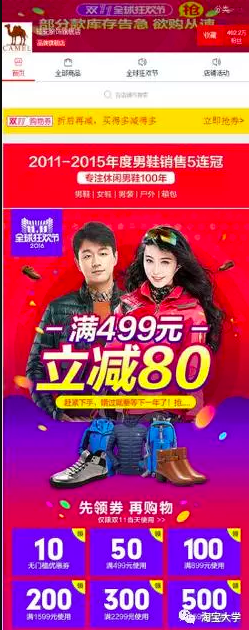 如上图所示,是2016年骆驼旗舰店双11首页页面,页面核心位置展现出来“满499减80”的促销利益点,强化促销,并且在下面放置一排优惠券以吸引客户眼球,整体页面也配合官方大促的热烈红色元素为主,把全店的促销氛围营造得很好。骆驼旗舰店在2016年度双11大战中,收获5.02亿总销售额,连续蝉联鞋服品牌冠军。