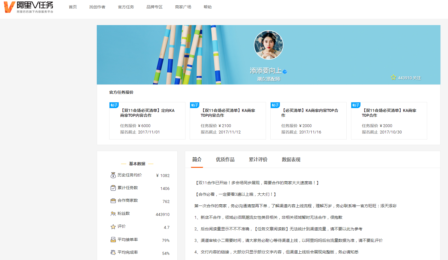点击达人的头像进入之后有这个达人的旺旺号,累计评价,优质作品等,可以看一下这个达人引流的效果好不好,然后我们再从里面选择一个比较好的达人帮我们去引流。