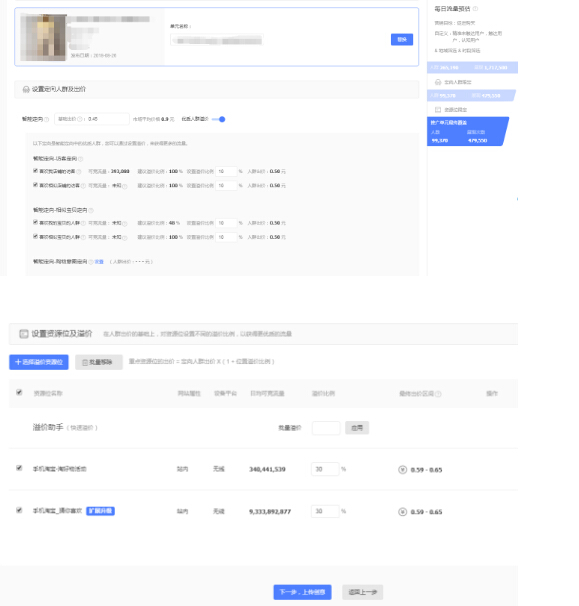 5、下一步,选择推广宝贝后,智能出价出市场均值的50%,访客定向和相似宝贝定向溢价5%-10%.资源位只选择猜你喜欢和淘好物,溢价30%。然后下一步,上传创意完成计划建立。